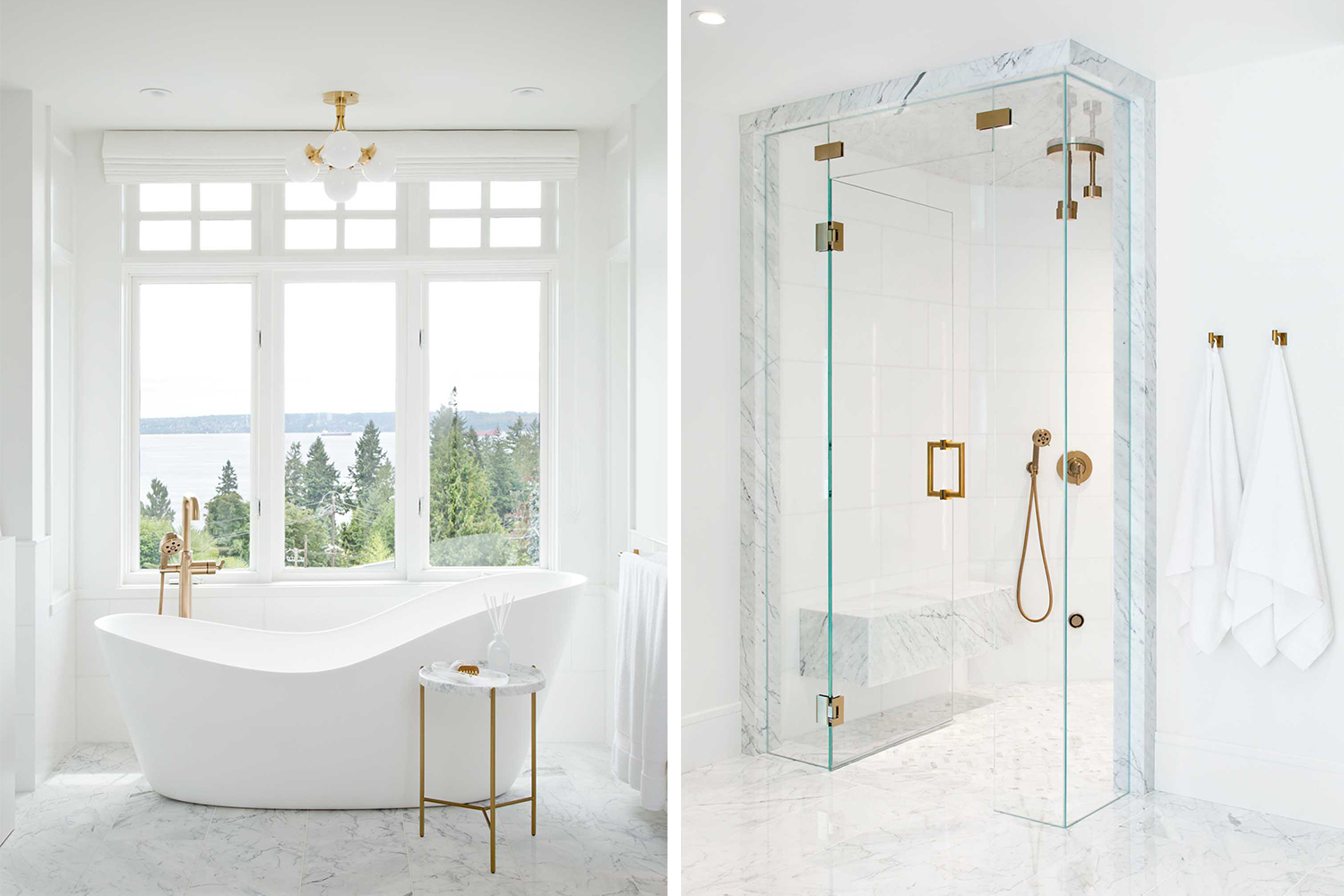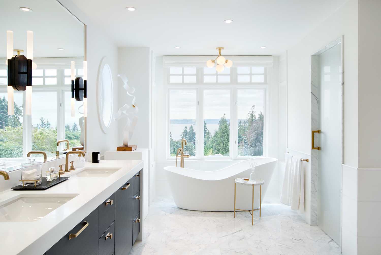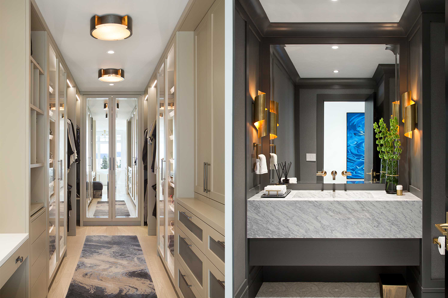 衛生間的設計是業(yè)主比較關(guān)注的空間。我們設計了梳妝臺來(lái)容納一個(gè)大理石水槽,與明亮的白色臺面和大理石瓷磚形成強烈對比,同時(shí)拉出大理石紋理的深色。浴室柜使用了炭灰色門(mén)板,配有金色拉絲五金是整個(gè)空間看起來(lái)更加高級,這種金色拉絲的五金運用到了幾乎所有空間,這讓各個(gè)空間互相呼應,風(fēng)格更加協(xié)調統一。